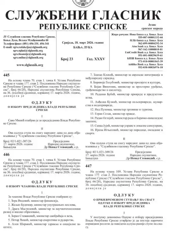 U Službenom glasniku Rs, broj 23 od 18. marta 2026. godine, objavljene su odluke Narodne skupštine Rs o izboru Save Minića za predsjednika Vlade, kao i odluka o izboru članova Vlade. U obje odluke navedeno je da stupaju na snagu dan nakon objavljivanja, te da su donesene na 36. posebnoj sjednici Narodne skupštine održanoj 17. marta 2026. godine.