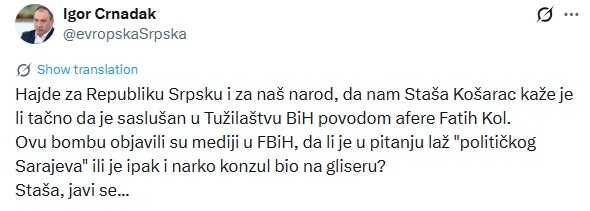 Zastupnik u Narodnoj skupštini Rs Igor Crnadak javno je zatražio od ministra vanjske trgovine i ekonomskih odnosa BiH Staše Košarca da se izjasni o navodima da je saslušan u Tužilaštvu Bosne i Hercegovine u vezi s aferom „Fatih Kol“.