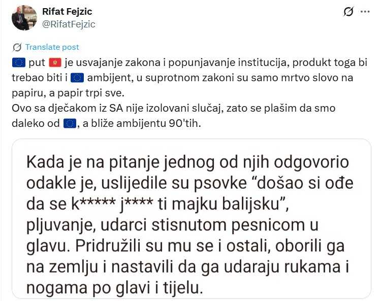 Reisul-ulema Crne Gore Rifat Fejzić oštro je osudio napad na 15-godišnjeg Sarajliju.