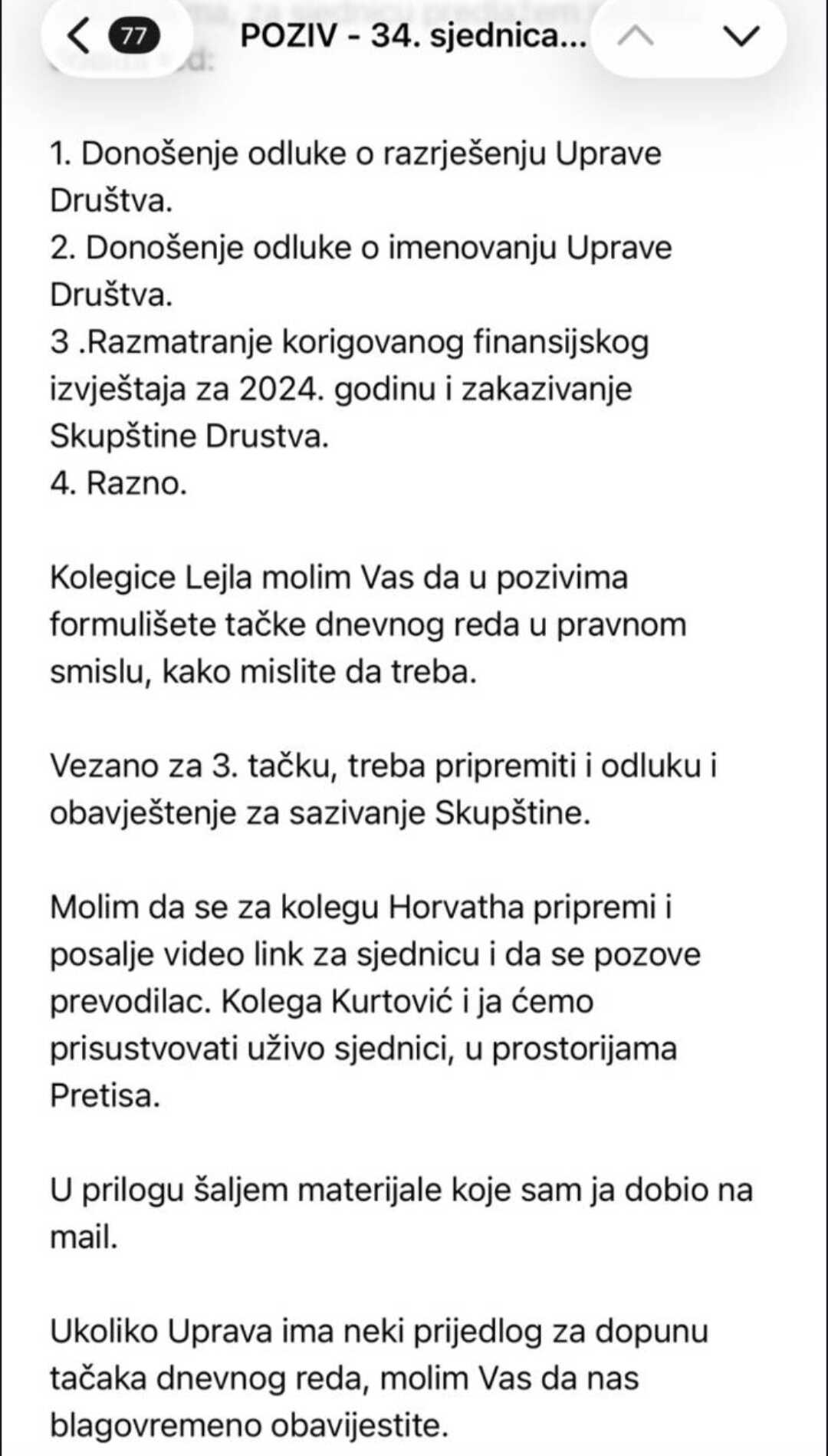 Općinski sud u Travniku zatim je donio rješenje o privremenoj mjeri osiguranja kojom se kompaniji Binas d.d. Bugojno zabranjuje provođenje odluka Skupštine održane 24. marta 2026. godine, uključujući i promjene u Nadzornom odboru, sve do okončanja sudskog postupka.