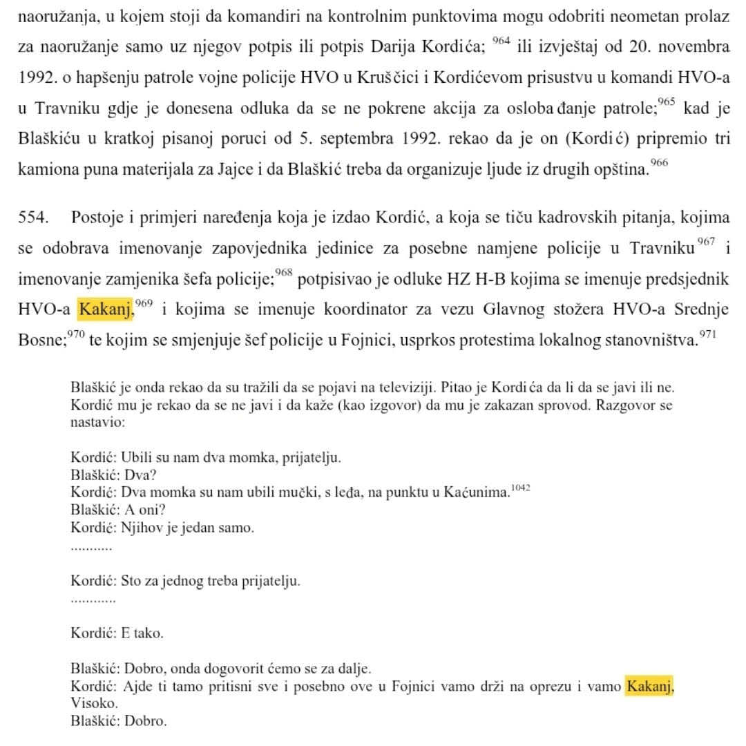 Kordić u jednom razgovoru nalaže generalu HVO-a Tihomiru Blaškiću, također presuđenom ratnom zločincu: "Ajde ti tamo pritisni sve i posebno ove u Fojnici, vamo drži na oprezu i vamo Kakanj, Visoko".