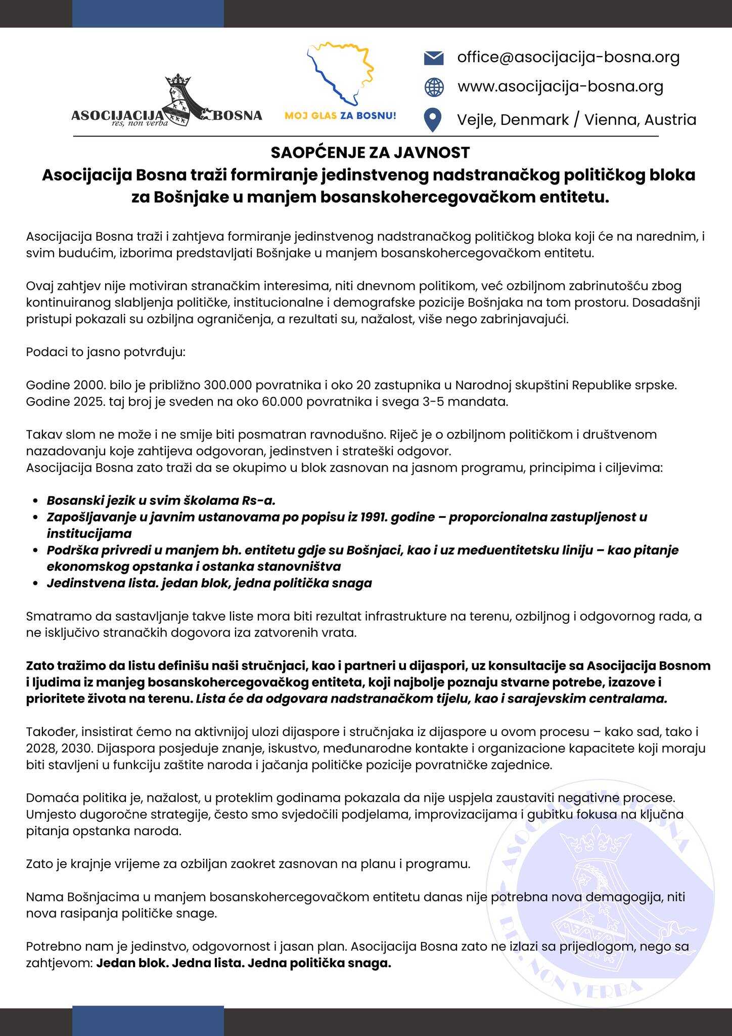 Potrebno nam je jedinstvo, odgovornost i jasan plan. Asocijacija Bosna zato ne izlazi sa prijedlogom, nego sa zahtjevom: