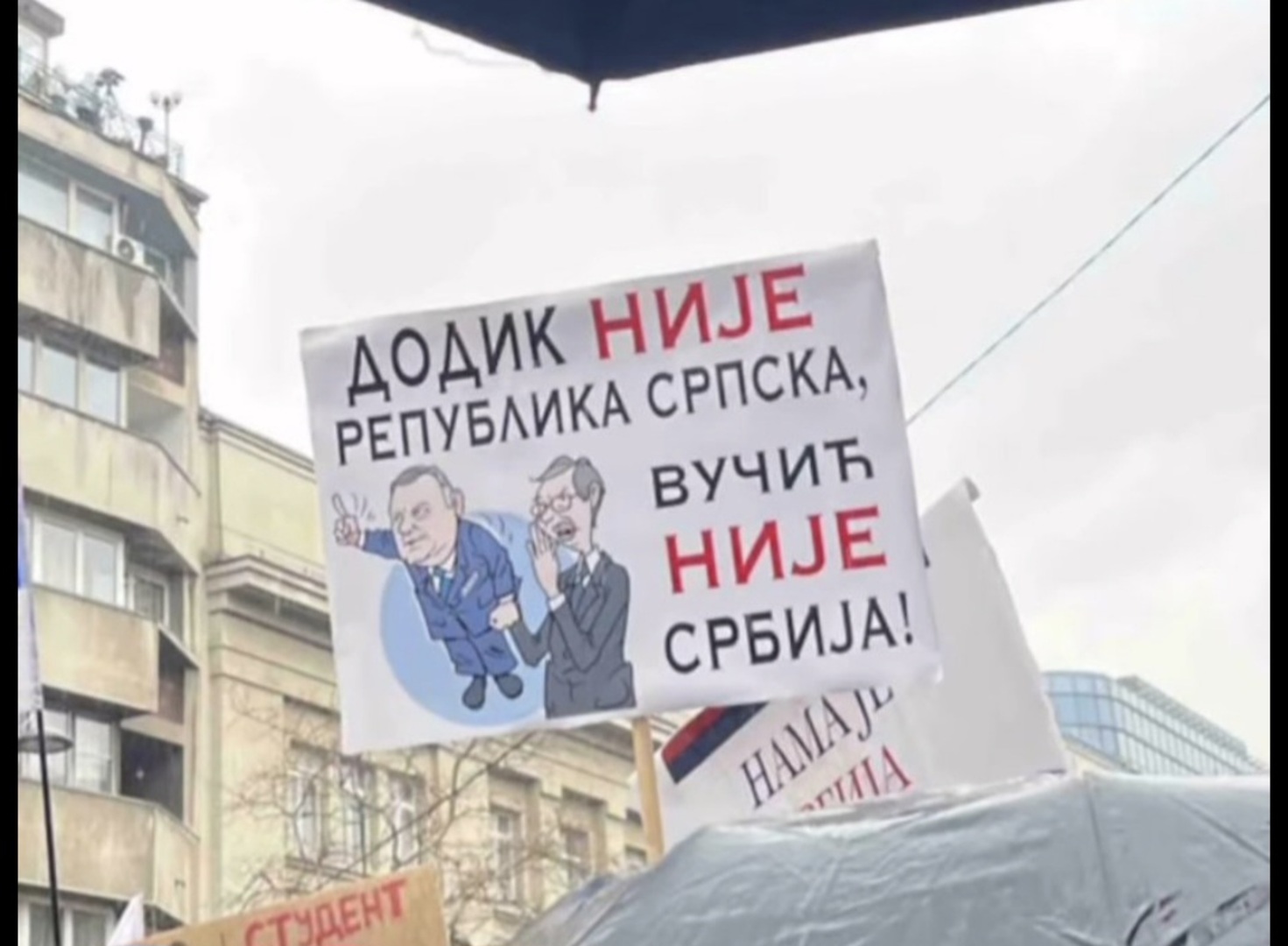 Među brojnim transparentima i parolama koji su viđeni danas na protestima u Beogradu posebnu pažnju je privukao transparent s natpisom koji se odnosi i na vlast u bh. entitetu Rs.