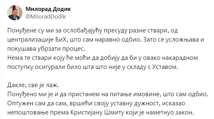 “Zato se usložnjava i pokušava ubrzati proces. Nema te stvari koju će moći da dobiju da bi u ovako nakaradnom postupku osigurali bilo šta što nije u skladu sa Ustavom. Dakle, sve je laž”, rekao je Dodik.