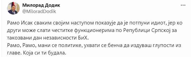 U objavi na svom X-nalogu (bivši Twitter), na kome mu je oduzeta službena verifikacija zbog američkih i britanskih sankcija, Dodik je napisao da "ne može EU od BiH tražiti demokratske standarde, a aplaudirati kolonijalnom statusu".