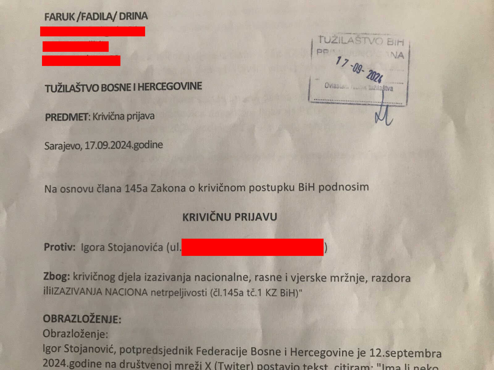 Sa danom zakašnjenja, a zbog čega se uredno izvinio, predao je krivičnu prijavu protiv potpredsjednika entiteta F BiH Igora Stojanovića (SDP=.
