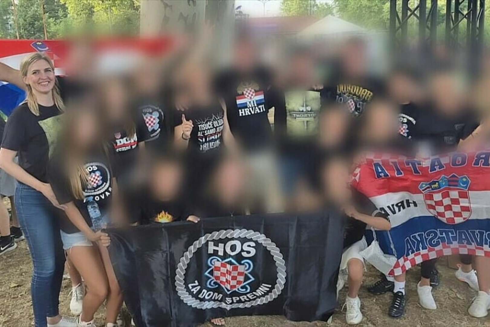 Zrinka Mužinić Bikić, državna sekretarka u Ministarstvu obrazovanja Hrvatske, fotografisana je s društvom među kojim su i maloljetna djeca, a nose HOS-ove majice sa natpisom ZDS. U rukama drže istu takvu zastavu.