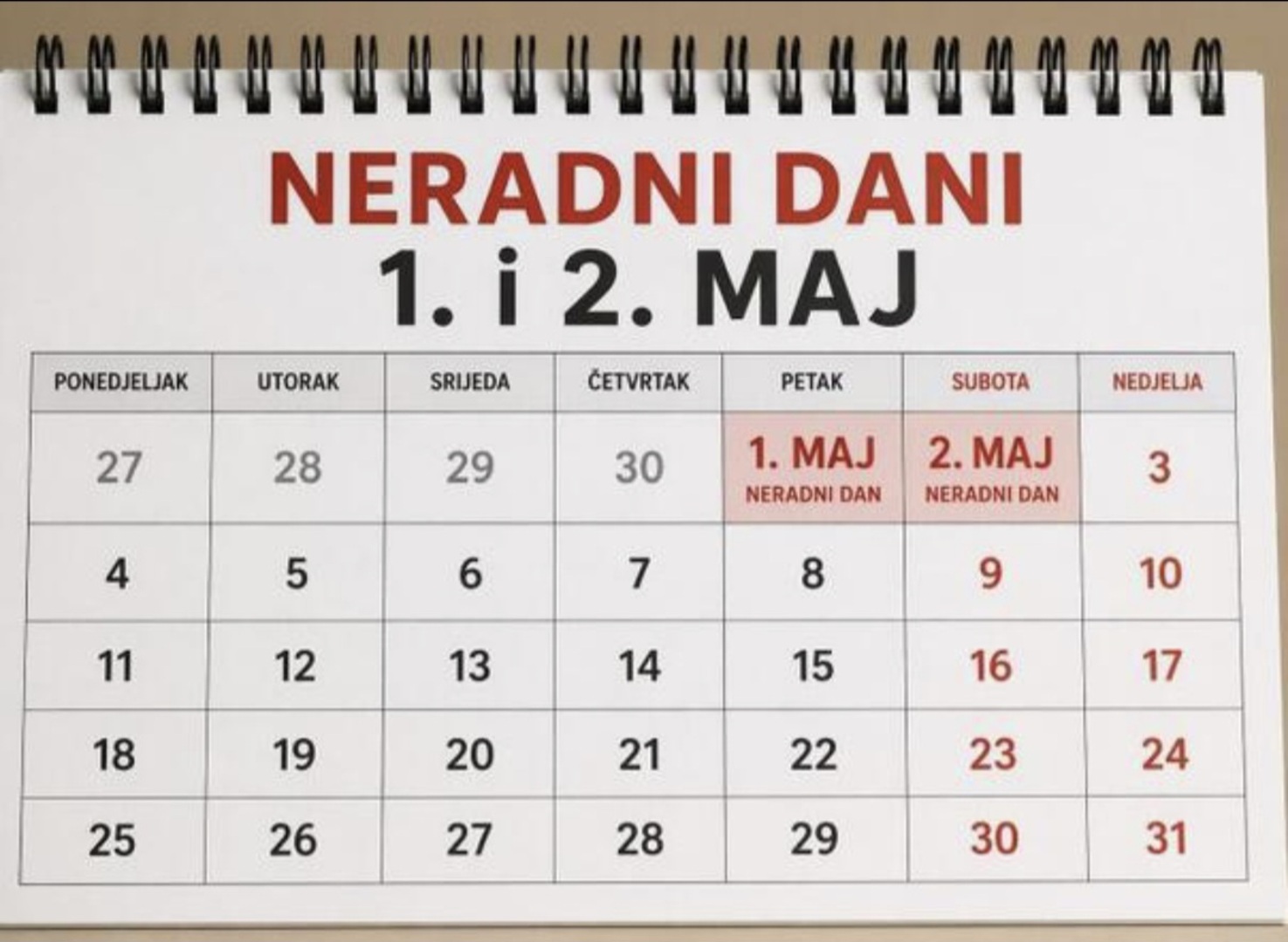 “Zakonom o praznicima (“Službeni list SFRJ”, broj: 6/73), koji se na osnovu Uredbe sa zakonskom snagom o preuzimanju i primjenjivanju saveznih zakona (“Službeni list RBiH”, broj: 2/92), odnosno Zakona o potvrđivanju uredbi sa zakonskom snagom (“Službeni list RBiH”, broj: 13/94), primjenjuje kao federalni zakon, propisano je da je Prvi maj Praznik rada i da se obilježava dva dana (1. i 2. maja). Shodno navedenom, informišemo Vas da su neradni dani u Federaciji Bosne i Hercegovine petak 1. maj i subota 2. maj 2026. godine”, navode iz Ministarstva.