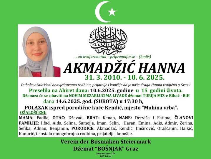 Dženaza 15-godišnjoj Hanni Akmadžić klanjat će se u subotu u džematu Turija, Medžlis Islamske zajednice Bihać. Ranije, u petak, 13. juna, dženaza-namaz Hanni obavit će se u 15:30 sati ispred džemata Bošnjak u Gracu.