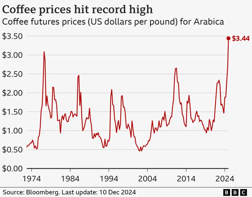 U utorak je cijena zrna arabike, koja čini većinu svjetske proizvodnje, premašila 3,44 dolara po funti (0,45 kg), skočivši za više od 80 posto ove godine. U međuvremenu, cijena vrste Robusta dostigla je novi maksimum u septembru.
