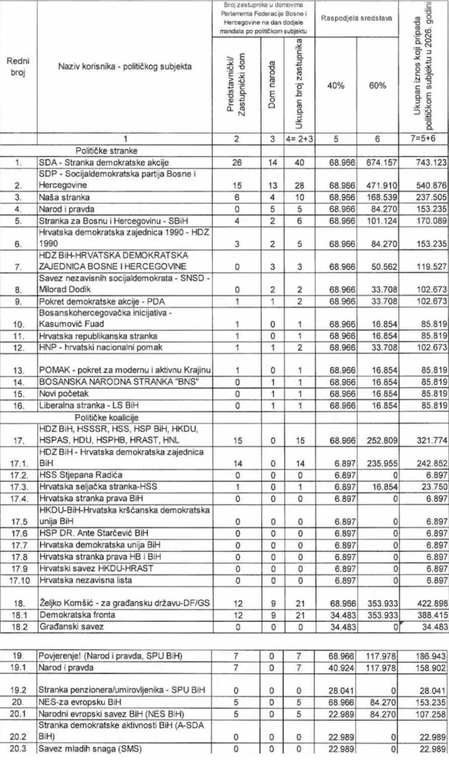 Vlada FBiH pozvala se na član 23. Zakona o izvršavanju Budžeta za 2026. godinu. Na prvom mjestu tabele je SDA koja je dobila 743.123 KM. HDZBiH je u tabeli zastupljen više puta, kao stranka ali i kao član određenih koalicija.