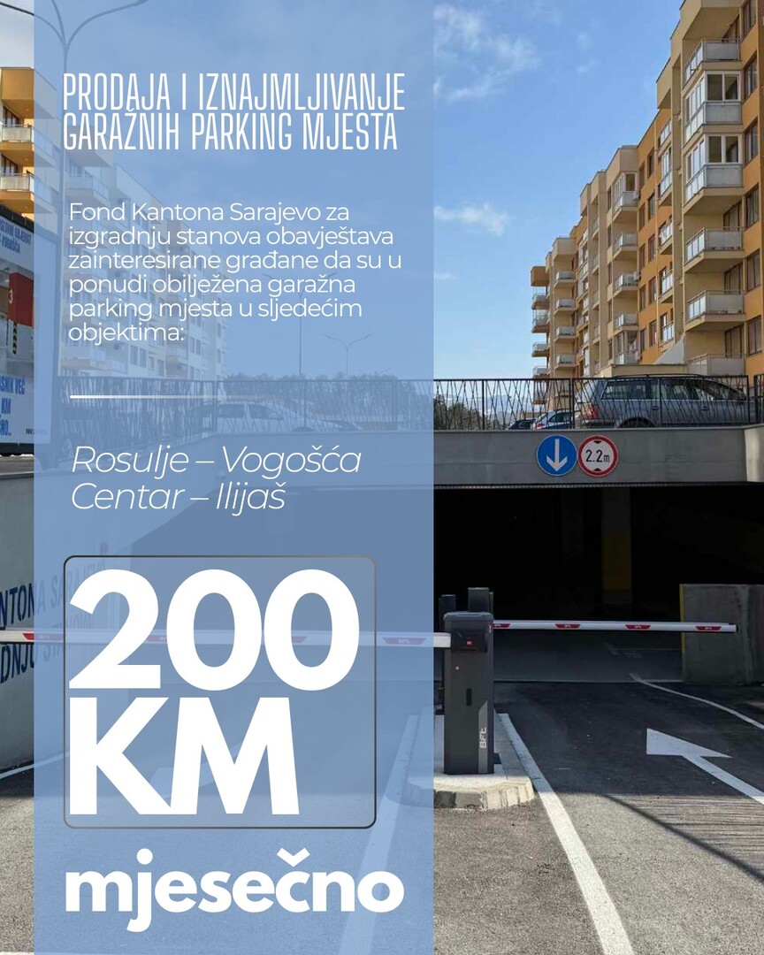 Fond Kantona Sarajevo za izgradnju stanova ponudio je građanima mogućnost kupovine i iznajmljivanja obilježenih garažnih parking mjesta na dvije lokacije u Kantonu Sarajevo, u Vogošći i Ilijašu.