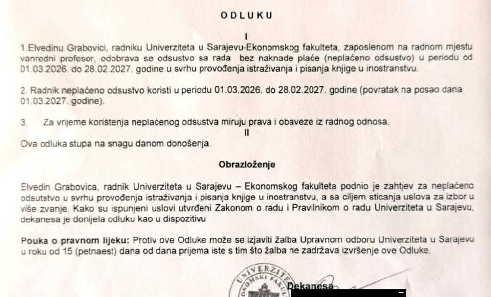 “Elvedinu Grabovici, radniku Univerziteta u Sarajevu – Ekonomskog fakulteta, zaposlenom na radnom mjestu vanredni profesor, odobrava se odsustvo sa rada bez naknade plaće (neplaćeno odsustvo) u periodu od 01.03.2026. do 28.02.2027. godine u svrhu provođenja istraživanja i pisanja knjige u inostranstvu. Radnik neplaćeno odsustvo koristi u periodu 01.03.2026. do 28.02.2027. godine (povratak na posao dana 01.03.2027. godine). Za vrijeme korištenja neplaćenog odsustva miruju prava i obaveze iz radnog odnosa”, navodi se u Odluci dekanese Ekonomskog fakulteta Melihe Bašić.