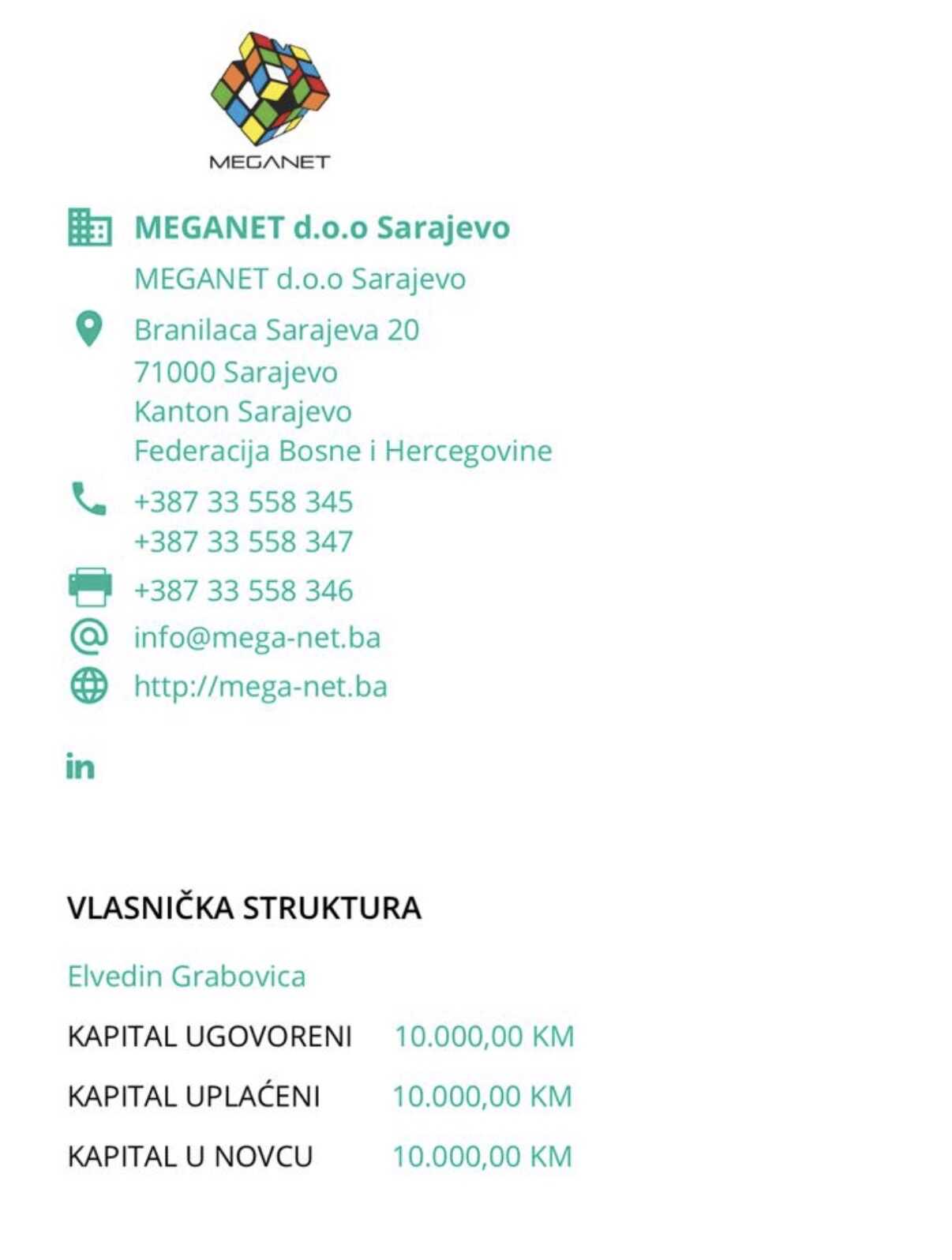 Drugi ugovor dobila je kompanija Meganet Sarajevo, čiji je osnivač također Elvedin Grabovica. Ova firma je registrirana na istoj adresi kao i firma BS Telecom koja, zahvaljujući upravo svojim vezama sa Elvedinom Grabovicom i federalnim premijerom Nerminom Nikšićem dobija većinu poslova na Autocestama Federacije BiH. Vrijednost ugovora koji je Meganet dobio iznosi oko pola miliona maraka. Inače, u kompaniji Meganet godinama je bio zaposlen Haris Nikšić, sin premijera Federacije BiH Nermina Nikšića.