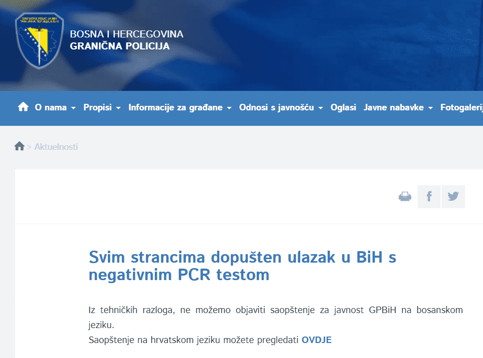 Radi se o informaciji da je u BiH moguć ulazak svih stranaca, ali uz negativan PCR test.