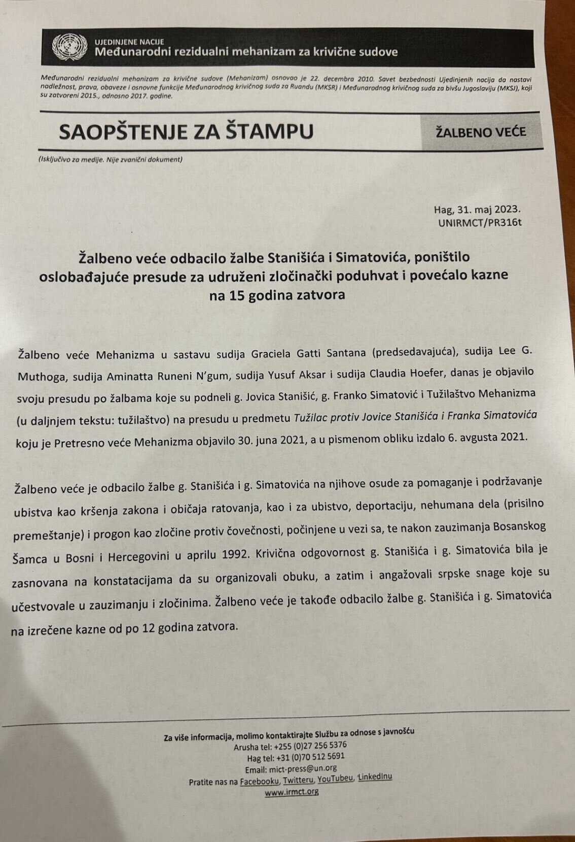Međunarodni mehanizam za krivične sudove (MMKS) u srijedu je izrekao konačnu presudu u trajanju od po 15 godina zatvora bivšim šefovima Službe državne bezbjednosti (SDB) Srbije Jovici Stanišiću i Franku Simatoviću, optuženim za zločine počinjene u Bosni i Hercegovini i Hrvatskoj, prenosi N1.