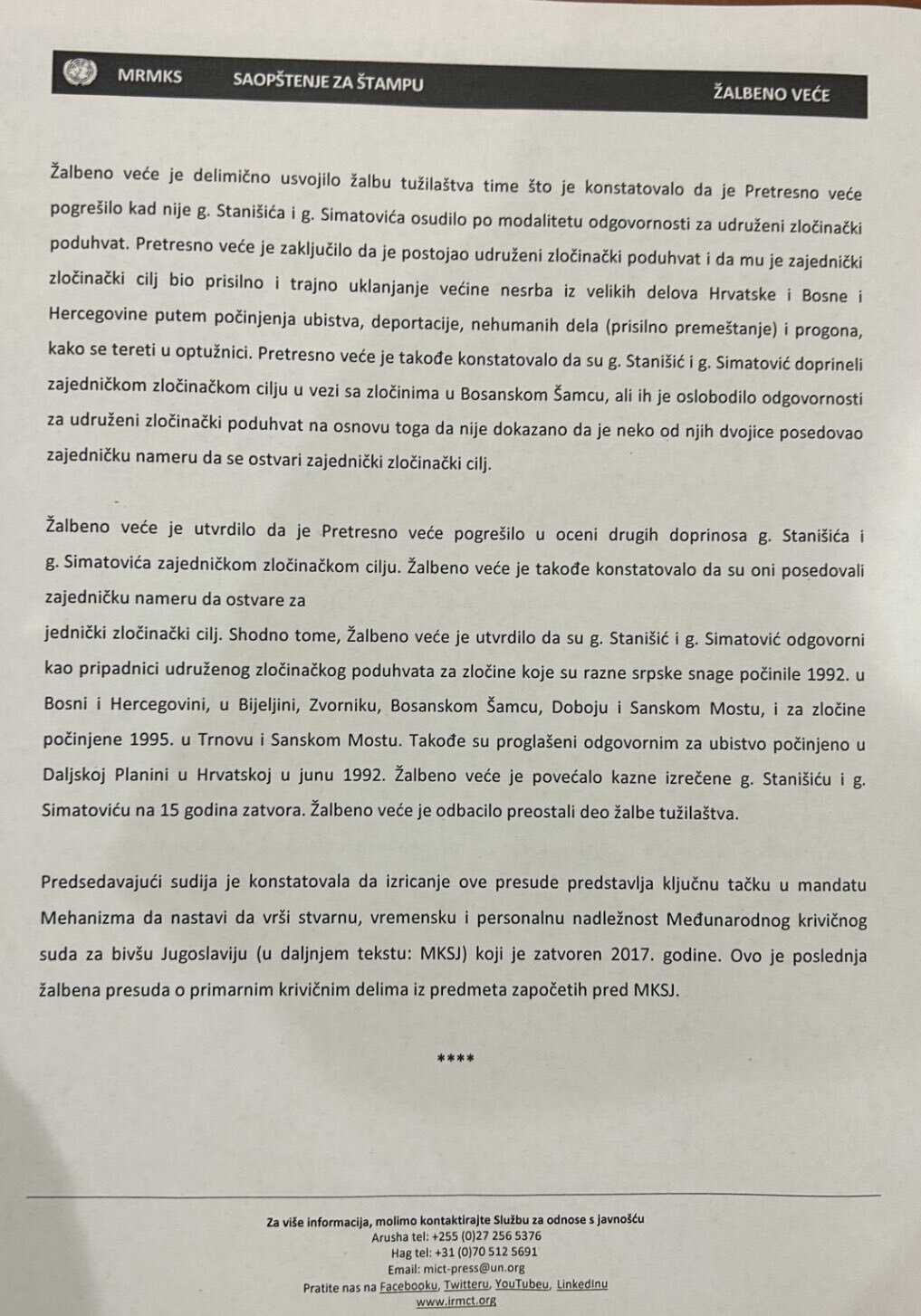 Predsjedavajuća petočlanog Apelacionog vijeća Graciela Gatti Santana kazala je da je ovo konačna presuda nakon postupaka započetih pred Međunarodnim krivičnim sudom za bivšu Jugoslaviju, čiji je nasljednik Mehanizam.