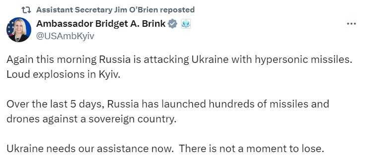 Američka ambasadorica u Ukrajini Bridget Brink na svom je službenom X-nalogu objavila alarmantan post.