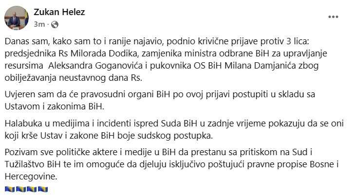Zukan Helez, ministar odbrane Bosne i Hercegovine, najavio je krivične prijave zbog pitanja javnih nabavki u ovom ministarstvu, nakon što mu je na potpis stigao višegodišnji sporazum po kojem bi Ministarstvo plaćalo višestruko veću cijenu za neke namirnice od realne.
