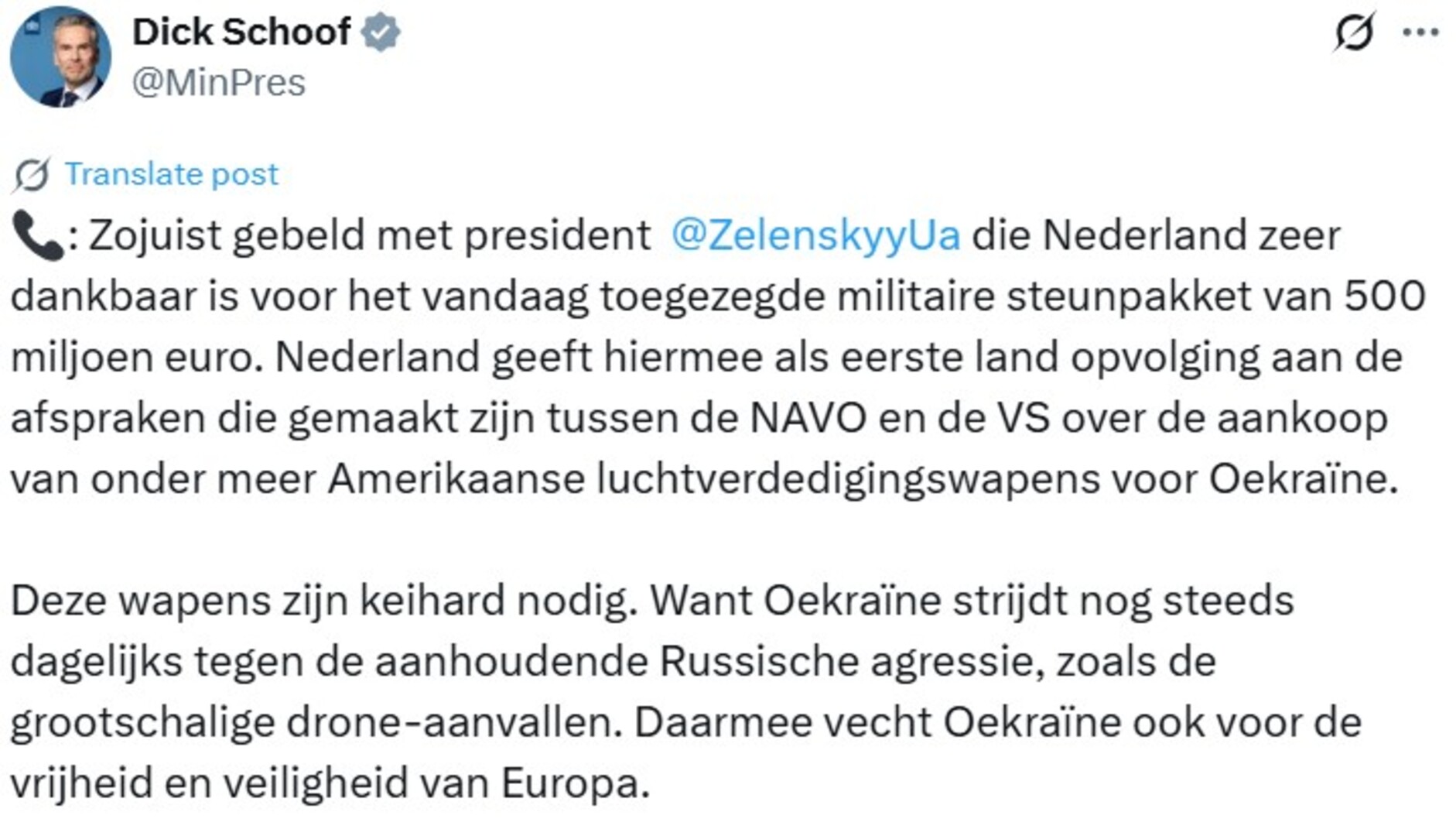 "Holandija je prva zemlja koja prati sporazum o oružju između NATO-a i SAD-a koji uključuje kupovinu američkih sistema protivvazdušne odbrane za Ukrajinu", napisao je holandski premijer Dick Schoof na mreži X nakon što je razgovarao telefonom sa ukrajinskim predsjednikom Volodimirom Zelenskim.