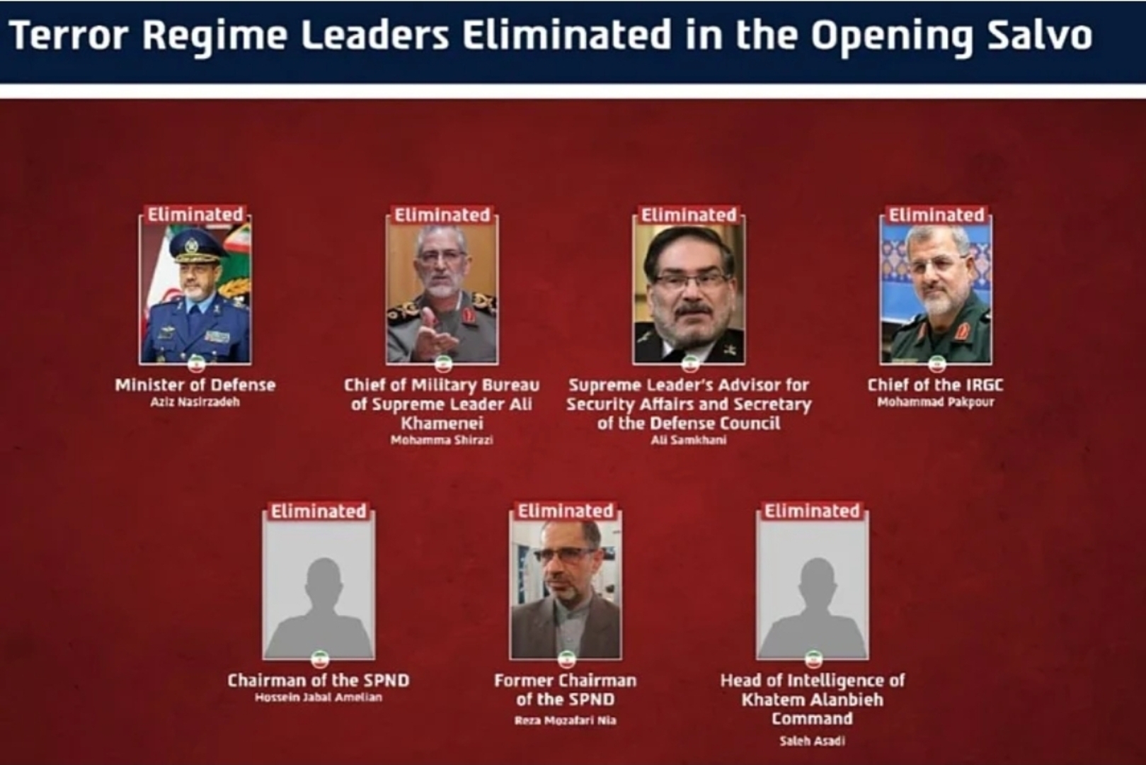 - Aziz Nasirzadeh, iranski ministar odbrane i bivši načelnik iranskog ratnog zrakoplovstva i zamjenik načelnika generalštaba. IDF kaže da je bio odgovoran za "industrije koje proizvode rakete dugog dometa i oružje prebačeno režimskim posrednicima, kao i za organizaciju SPND, koja je unaprijedila projekte u oblastima nuklearnog, biološkog i hemijskog oružja".