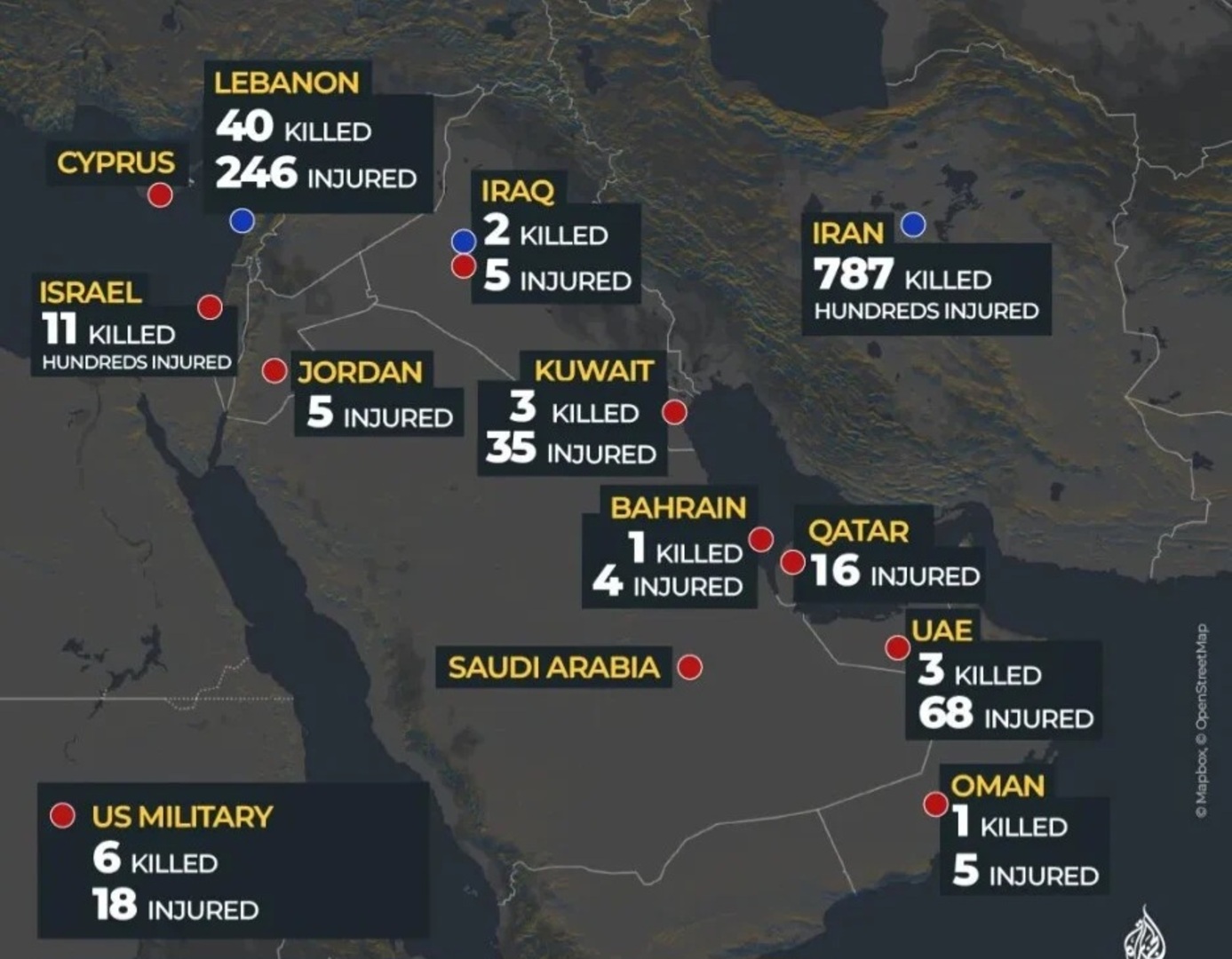 U Izraelu je do sada smrtno stradalo 11 osoba, dok ih je više hiljada povrijeđeno. Kada je u pitanju vojska Sjedinjenih Američkih Država, poginulo je šest vojnika, a 18 ih je povrijeđeno.