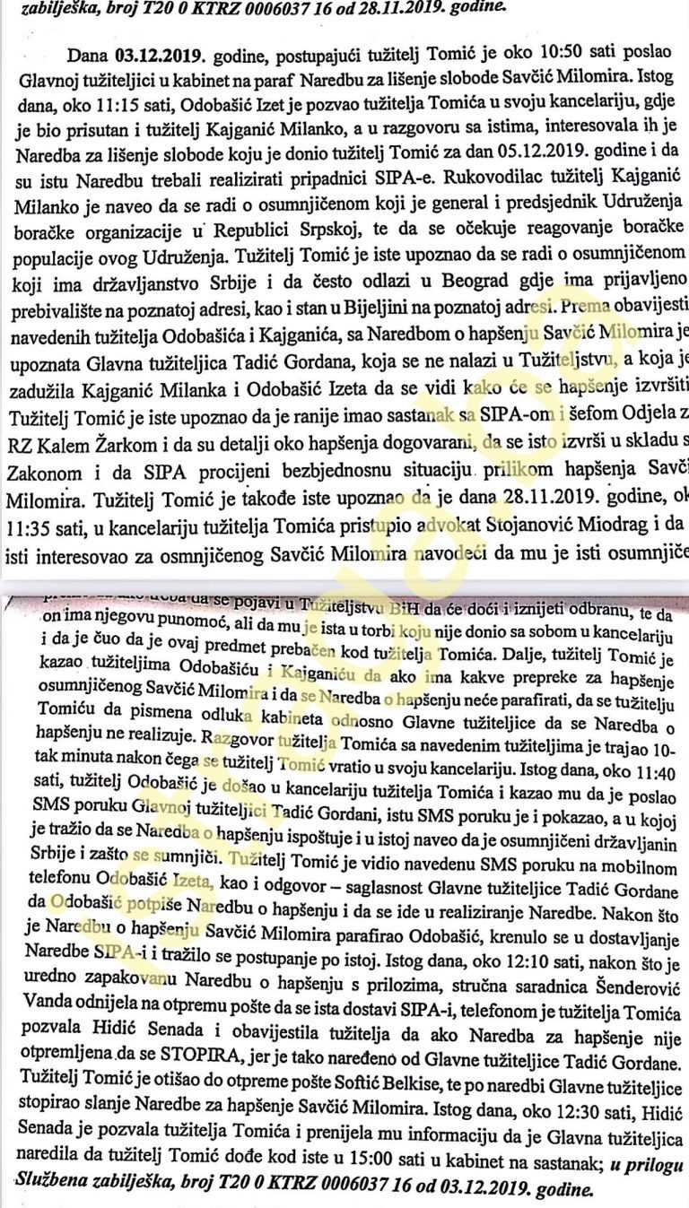 „Dana 3.12. 2019. godine, postupajući tužitelj Tomić je oko 10.50 sati poslao Glavnoj tužiteljici u Kabinet na paraf Naredbu za lišenje slobode Savčić Milomira. Istog dana, oko 11.15 sati, Odobašić Izet je pozvao tužitelja Tomića u svoju kancelariju gdje je bio prisutan i tužitelj Kajganić Milanko, a u razgovoru sa istima, interesovala ih je Naredba za lišenje slobode koju je donio tužitelj Tomić za dan 5. 12. 2019. godine i da su istu Naredbu trebali realizirati pripadnici SIPA-e“, navodi u svom Izvještaju postupajući tužilac Tomić.