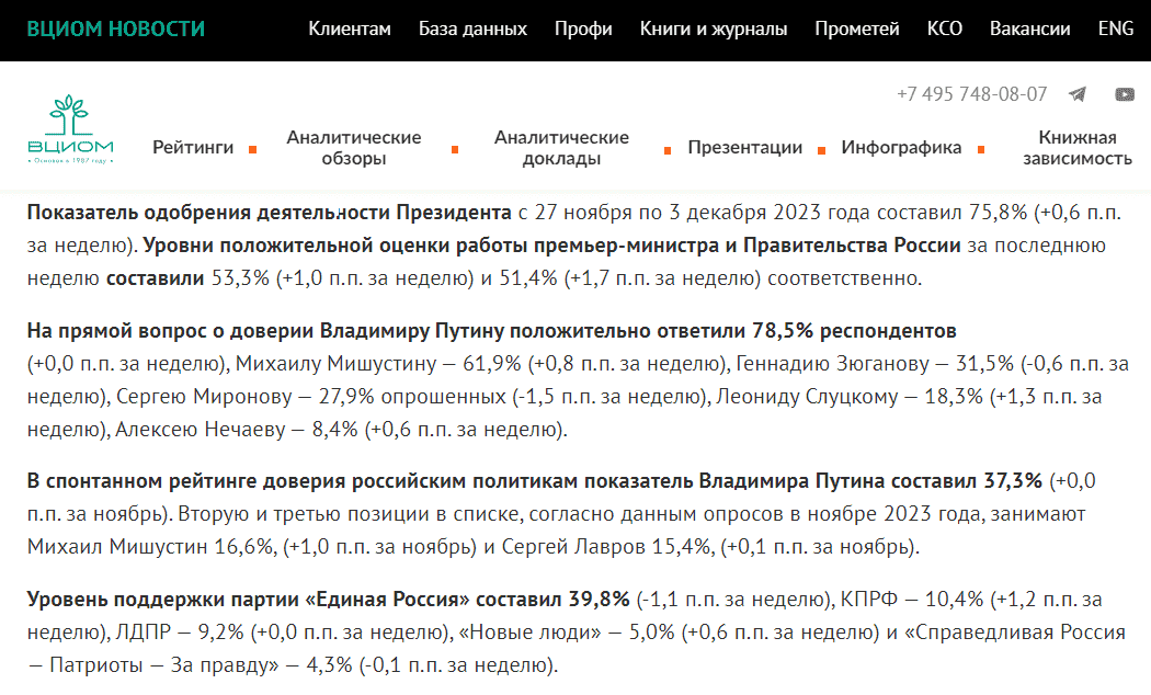 Prema objavljenim podacima na sajtu VTsIOM, na pitanje da li generalno odobravaju ili ne odobravaju aktivnosti ruskog predsednika, 75,8% je odgovorilo da odobrava, 14,8% ne odobrava.