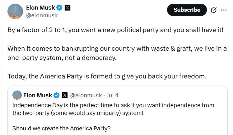 Direktor kompanija Tesla i SpaceX prvi put je javno pomenuo ideju o osnivanju stranke nakon što je došlo do javnog i oštrog razlaza s predsjednikom SAD Donaldom Trumpom. Ove sedmice, Musk je ponovo aktualizirao tu ideju, nakon što su američki zakonodavci odobrili Trumpov sveobuhvatni zakon o porezima i potrošnji.
