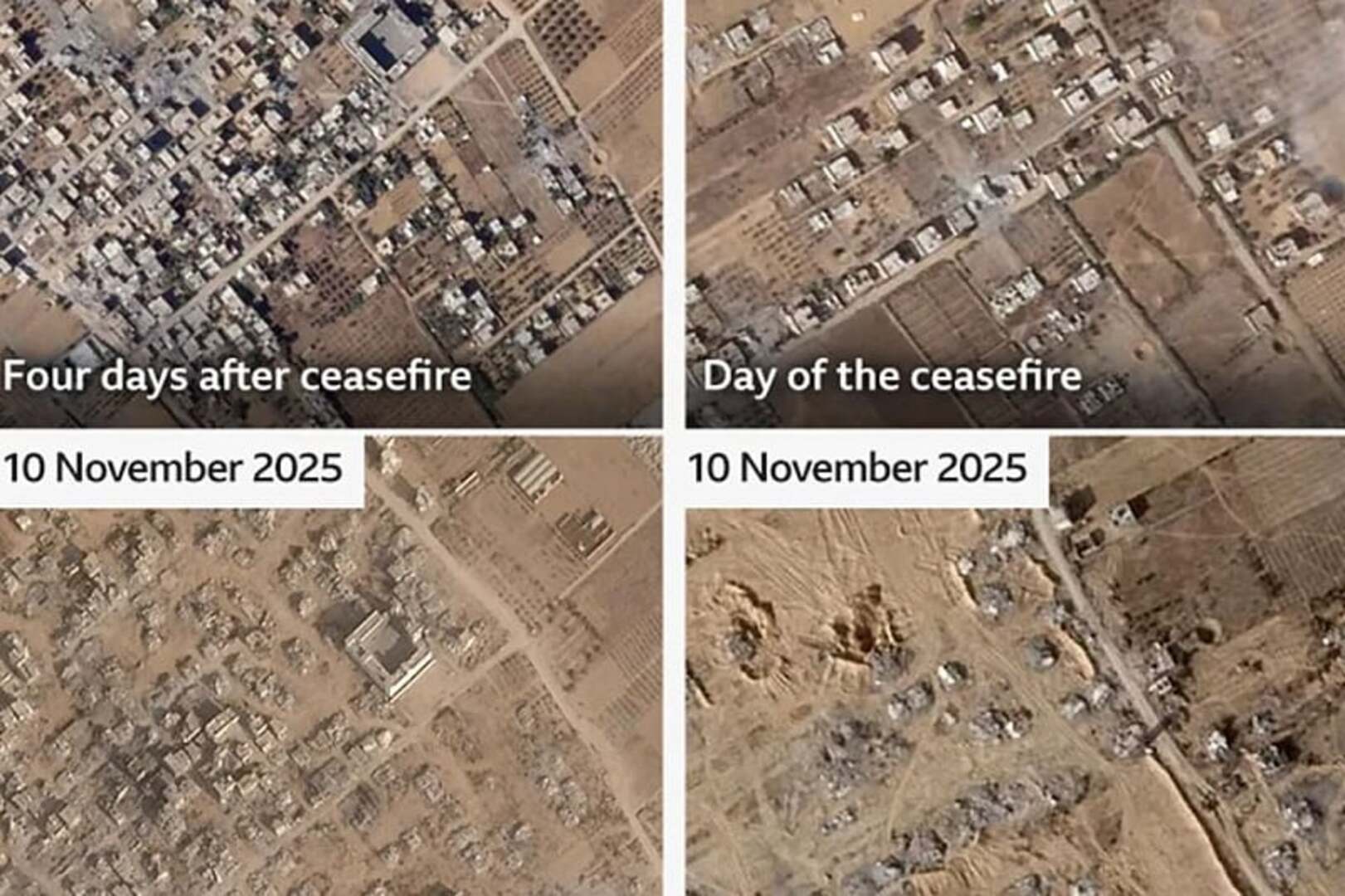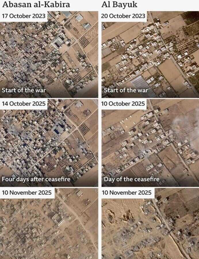 Nove fotografije, od kojih je najnovija snimljena 8. novembra, pokazuju da su čitava naselja pod kontrolom IDF-a sravnjena sa zemljom za manje od mjesec dana, očigledno rušenjem.