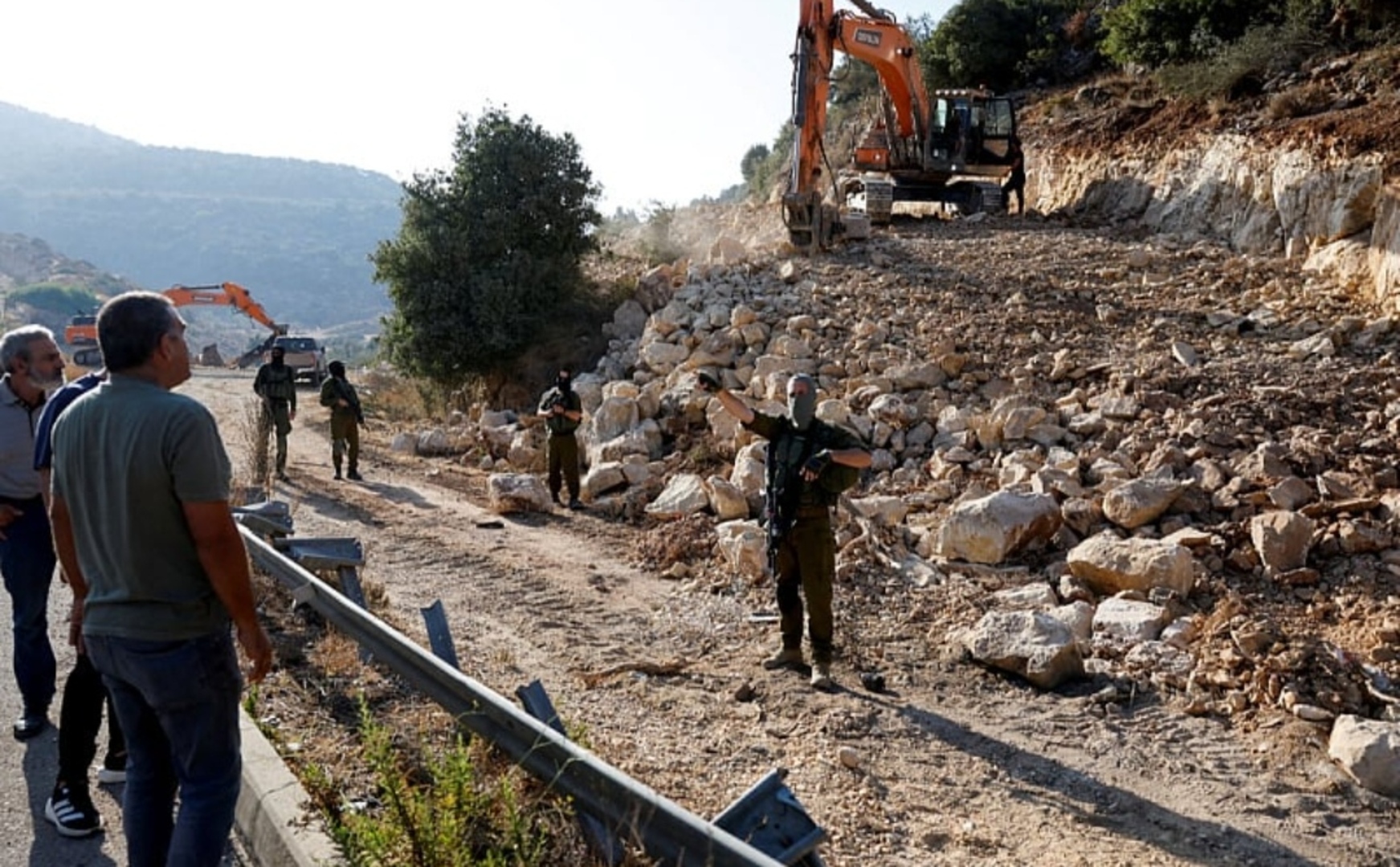 Okruženi pripadnicima izraelske vojske buldožeri probijaju novi put koji će odsjeći selo Beit Ur al-Fauqa za potrebe novih naselja u koja će se doseliti ilegalni doseljenici.