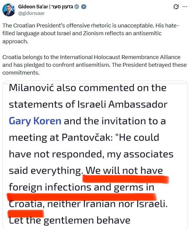 Sa'ar je podsjetio da je Hrvatska članica Međunarodnog saveza za sjećanje na holokaust i da se obavezala boriti protiv antisemitizma, poručivši kako je Milanović takvim izjavama iznevjerio te obaveze.