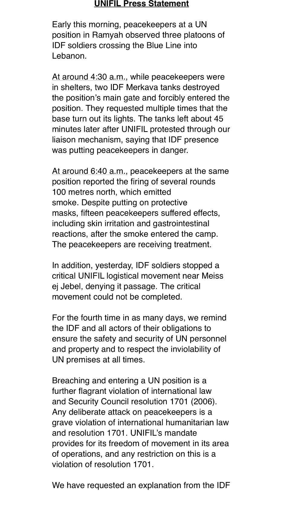 U saopćenju se navodi da se incident dogodio rano jutros na položaju UN-a u Ramiji. Otprilike u 04:30 po lokalnom vremenu , dok su mirovne snage bile u skloništima, dva izraelska tenka Merkava su "razrušila glavnu kapiju položaja i nasilno ušla" u objekat. Izraelske trupe su tada "više puta tražile da baza ugasi svjetla".