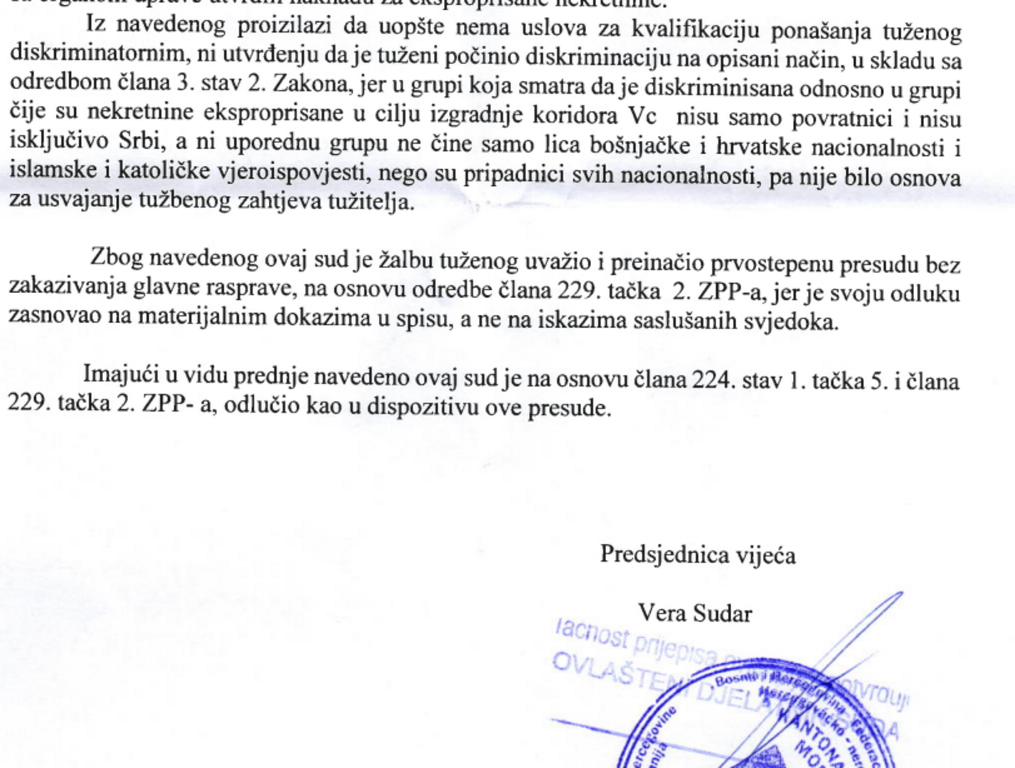 U nastavku se ističe da je "Kantonalni sud u Mostaru utvrdio da uopće nema uslova za kvalifikaciju ponašanja tuženog diskriminatornim, ni u tvrđenju da je tuženi počinio diskriminaciju, jer u grupi koja smatra da je diskriminirana odnosno u grupi čije su nekretnine eksproprirane u cilju izgradnje koridora Vc nisu samo povratnici i nisu isključivo Srbi, a ni uporednu grupu ne čine samo lica bošnjačke i hrvatske nacionalnosti i islamske i katoličke vjeroispovijesti, nego su pripadnici svih nacionalnosti, pa nije bilo osnova za usvajanje tužbenog zahtjeva tužitelja" navode iz JP Autoceste.