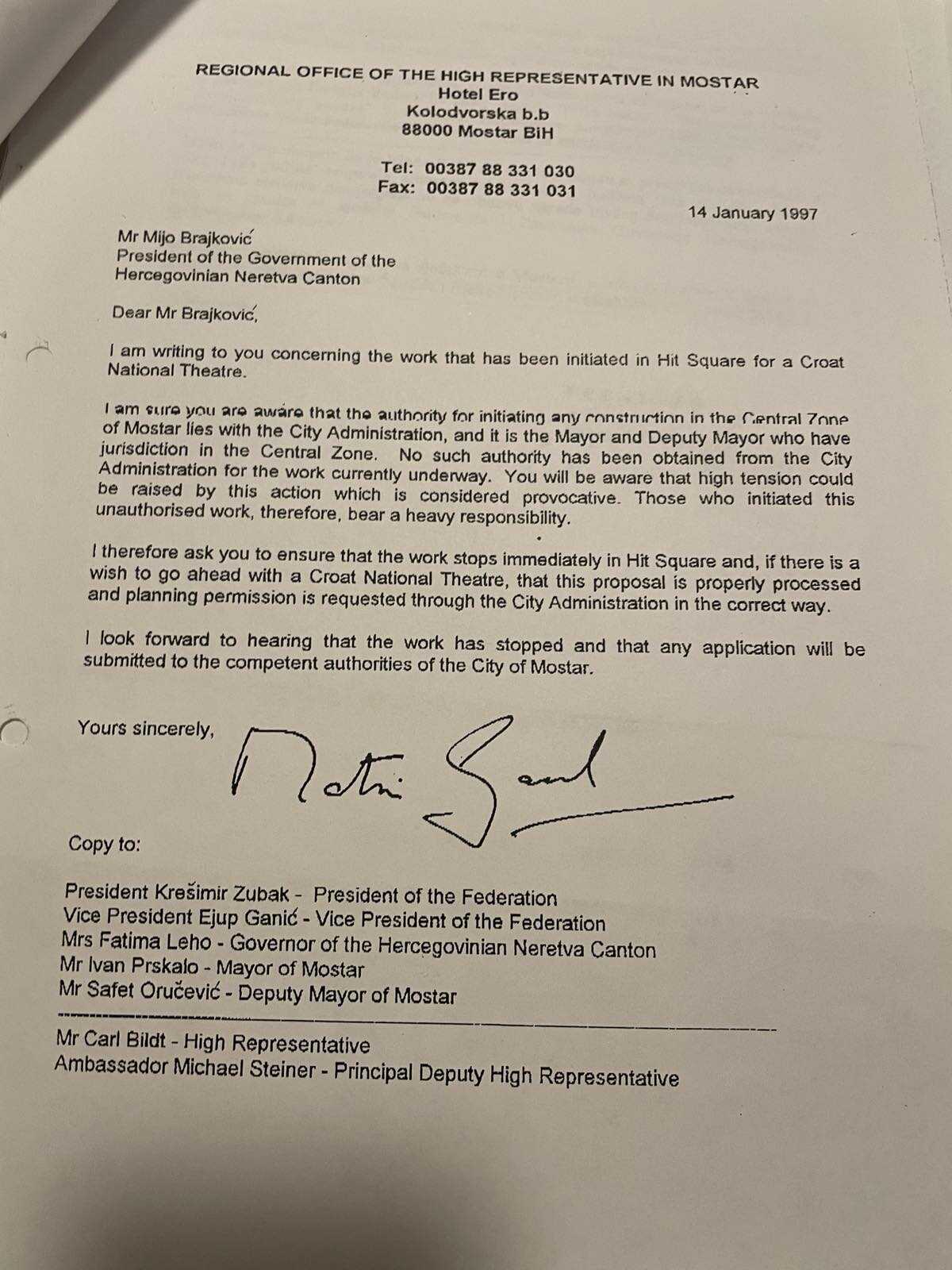 Zato Vas molim da osigurate da se radovi na Trgu HIT smjesta prekinu i, postoji li želja za da se nastavi sa Hrvatskim narodnim kazalištem, da se taj prijedlog obradi kako treba i da se od Gradske uprave na ispravan način zatraži projektna dozvola. Nadam se da ću biti obaviješten da su radovi prekinuti te da će zahtjev biti podnesen za to nadležnim vlastima Grada Mostara", stoji u Garrodovom pismu. Ono je poslato kako tadašnjim čelnicima Mostara - Ivanu Prskalu, gradonačelniku i Safetu Oručeviću, dogradonačelniku Mostara.