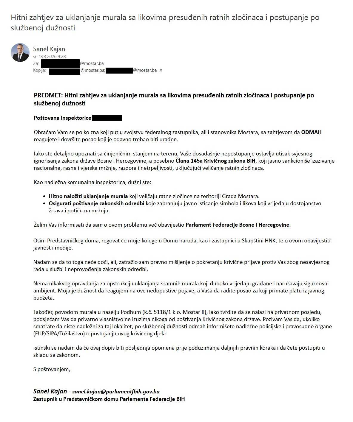 Kao federalni zastupnik i stanovnik Mostara, pozvao je nadležnu inspekciju da hitno reaguje i izvrši uklanjanje murala i grafita mržnje na području grada, uz obavezu dosljednog poštivanja zakonskih odredbi koje zabranjuju javno veličanje ratnih zločinaca.