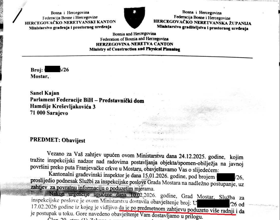 Ranije je, kako ističe, zaprimio i službeni dopis inspekcije Grada Mostara u kojem je potvrđeno da je, nakon njegove prijave i zahtjeva za inspekcijskim nadzorom, doneseno rješenje o obustavi radova na izgradnji spomenika „Kralju Tomislavu“.