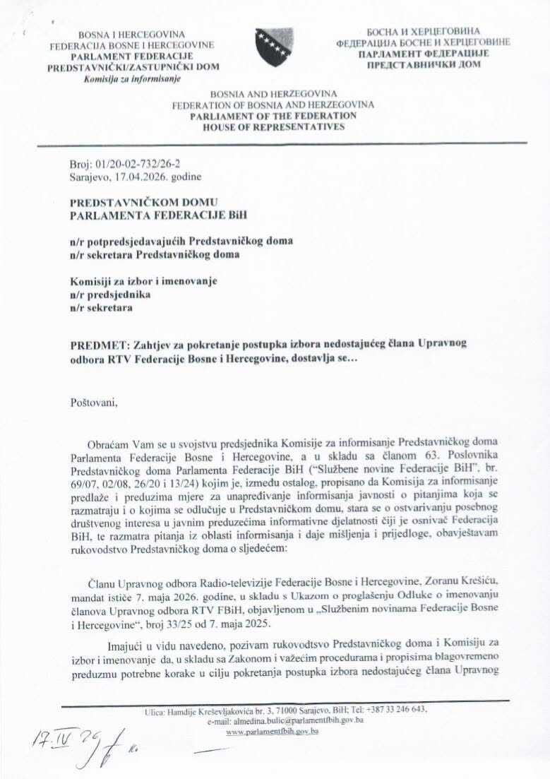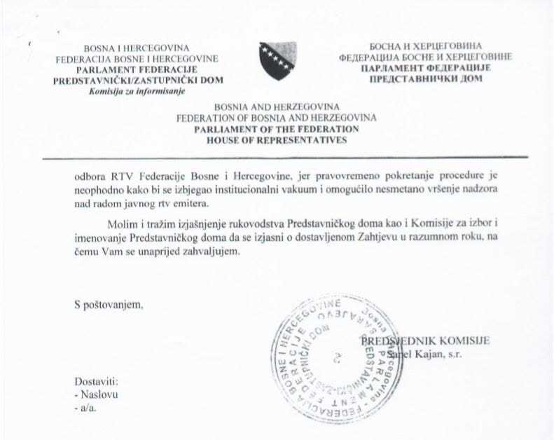 Zastupnik Demokratske fronte iz Mostara i predsjednik Komisije za informisanje Predstavničkog doma Parlamenta Federacije Bosne i Hercegovine Sanel Kajan zvanično je obavijestio rukovodstvo ovog doma i Komisiju za izbor i imenovanje o potrebi hitnog pokretanja procedure izbora novog člana Upravnog odbora RTV Federacije BiH.