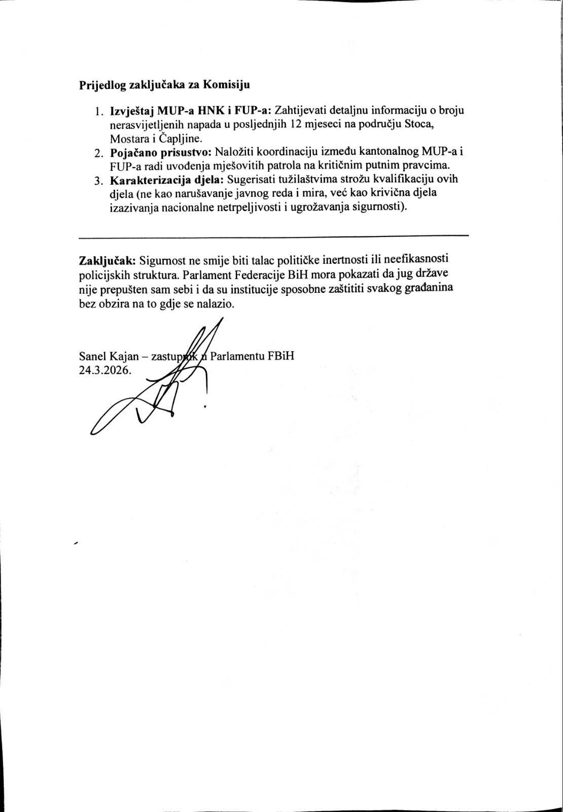 Kajan u svojoj inicijativi, pozivajući se na članove 11. i 116. Poslovnika, zahtijeva hitno očitovanje nadležnih institucija uz obavezno prisustvo rukovodstva Federalne uprave policije (FUP) i Ministarstva unutrašnjih poslova HNK.