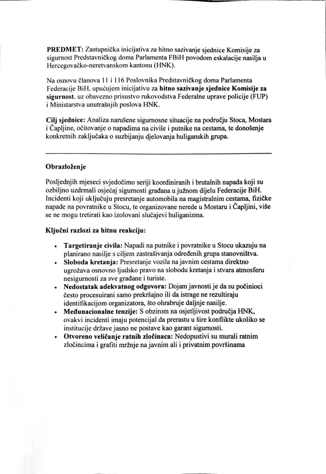 "Posljednjih mjeseci svjedočimo seriji brutalnih napada koji su ozbiljno uzdrmali osjećaj sigurnosti građana u južnom dijelu Federacije BiH. Incidenti koji uključuju presretanje automobila na magistralnim cestama, fizičke napade na povratnike u Stocu, te organizovane nerede u Mostaru i Čapljini, više se ne mogu tretirati kao izolovani slučajevi huliganizma", navodi se u obrazloženju inicijative.