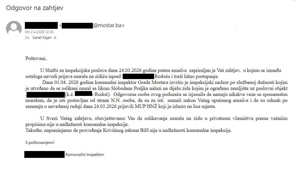 Zastupnik Demokratske fronte iz Mostara Sanel Kajan upozorio je na, kako navodi, dugotrajne probleme u radu Službe za inspekcijske poslove Grada Mostara, posebno kada je riječ o postupanju u slučajevima murala i grafita s govorom mržnje.