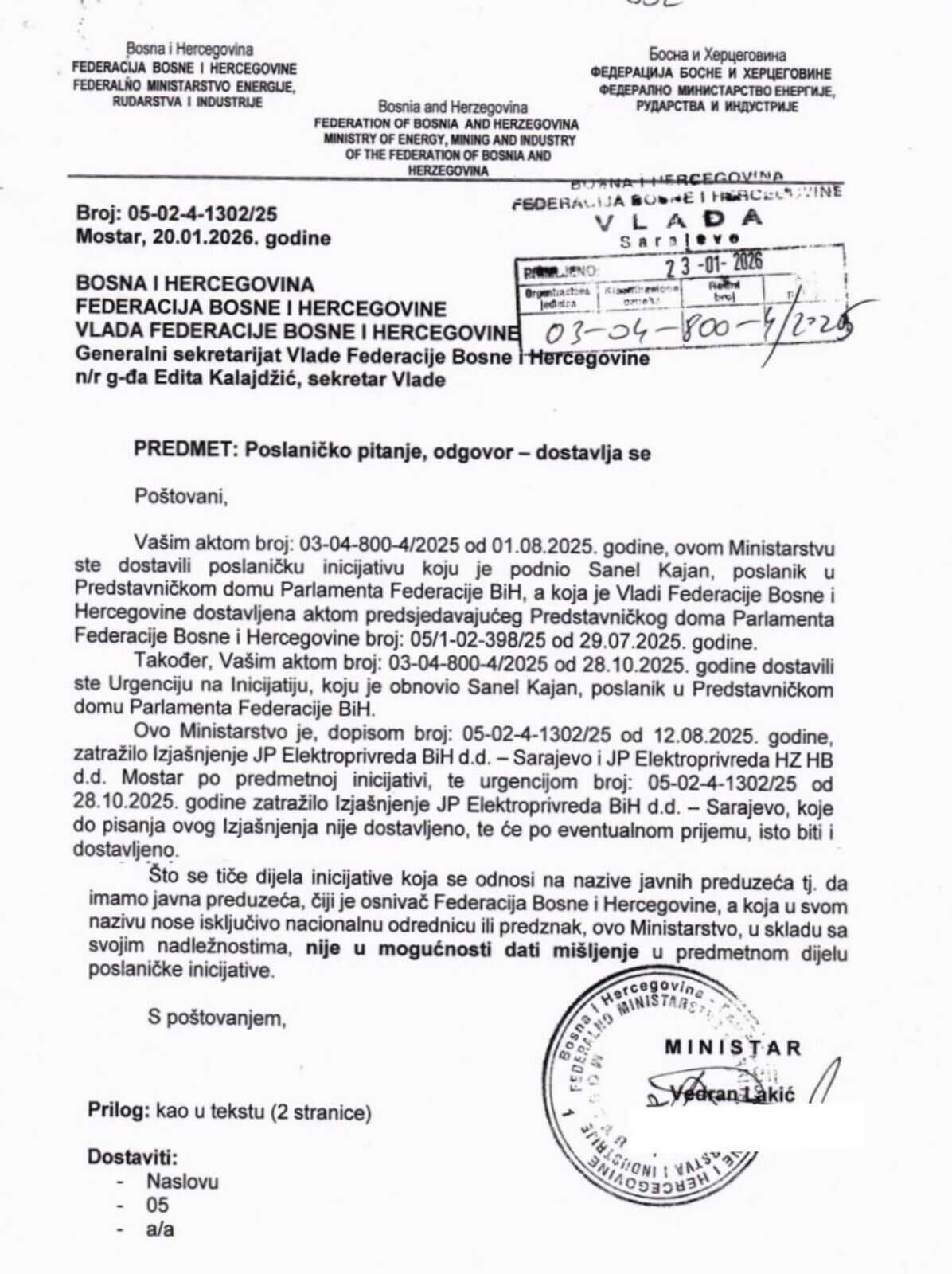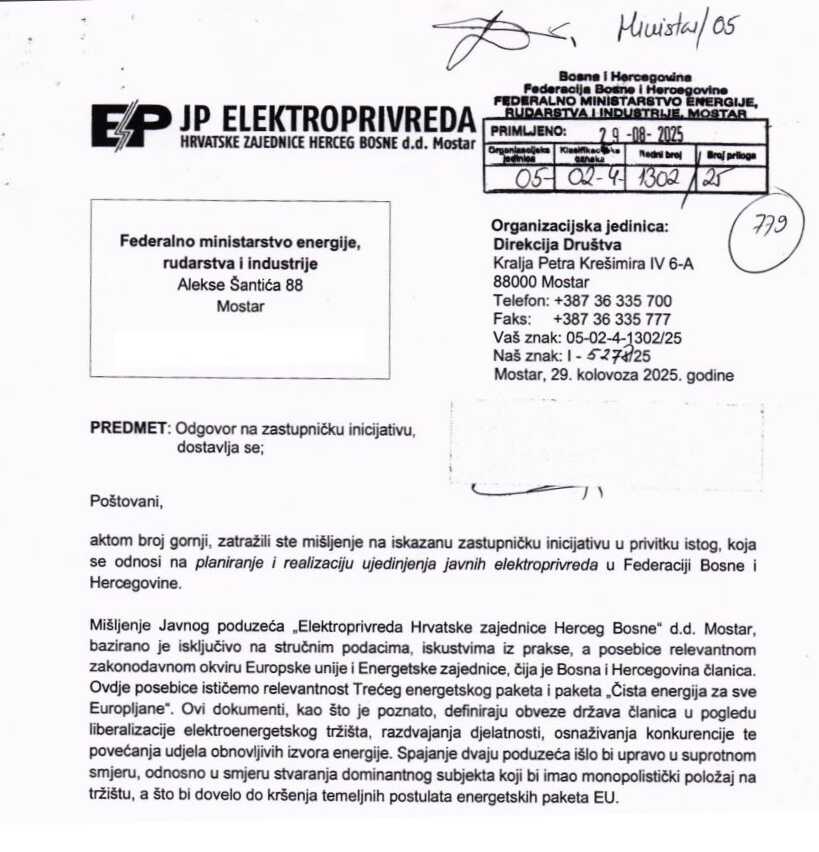 Zastupnik Demokratske fronte u Predstavničkom domu Parlamenta Federacije Bosne i Hercegovine Sanel Kajan saopćio je da je krajem januara 2026. godine zaprimio odgovore na zastupničku inicijativu koju je podnio još 29. jula 2025. godine, a kojom je zatražio da Vlada Federacije BiH razmotri mogućnost ujedinjenja dvije javne elektroprivrede koje imaju istog vlasnika i djeluju u istom entitetu – JP Elektroprivreda BiH i JP Elektroprivreda "Hrvatske zajednice Herceg Bosne".