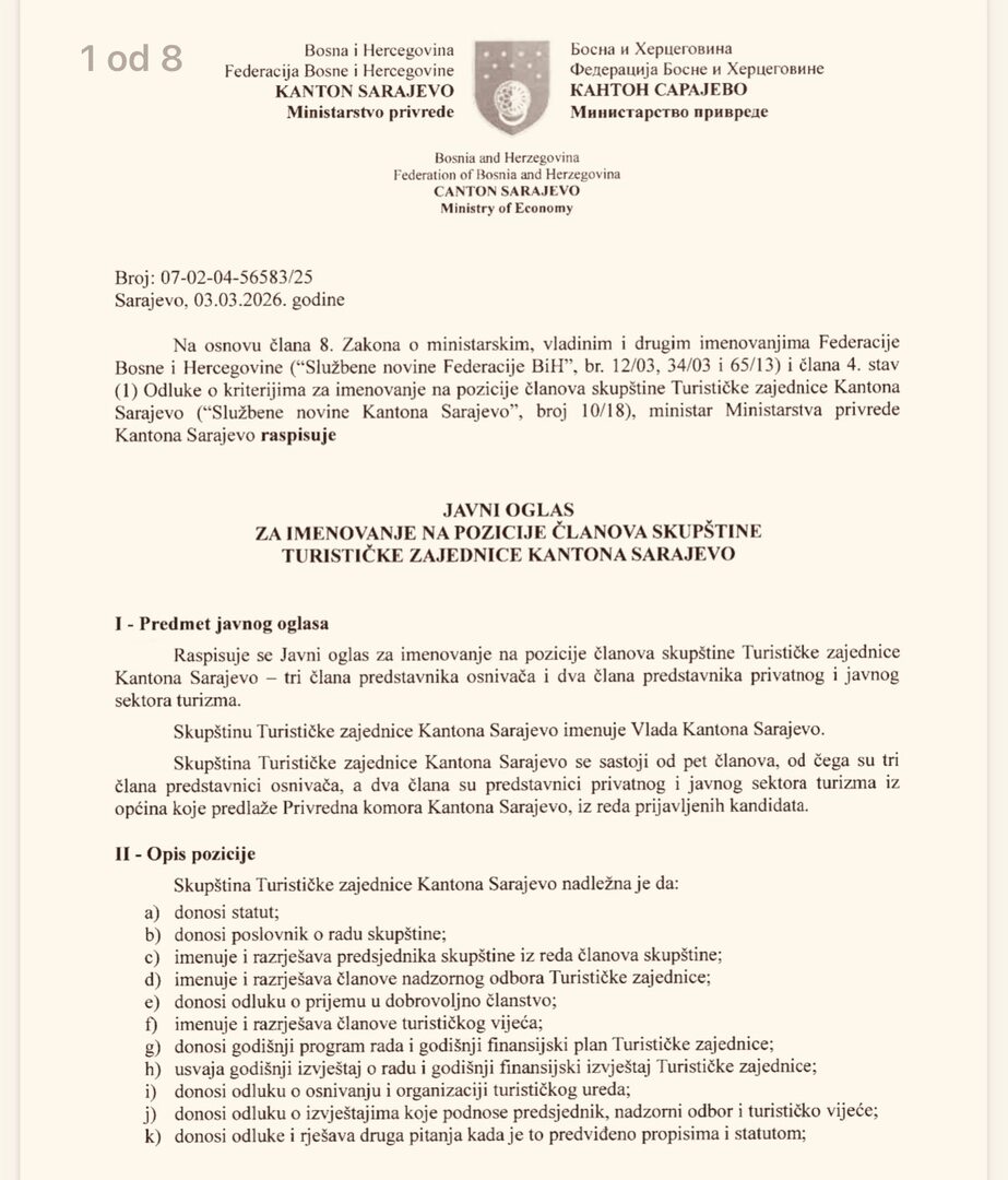 Za pojašnjenje smo se obratili Ministarstvu privrede KS iz kojeg su naveli da je “Javni oglas za imenovanje na pozicije članova Skupštine Turističke zajednice Kantona Sarajevo broj: 07-02-04-48601/25 od 27.10.2025. godine poništen jer nije dostavljen dovoljan broj potpunih i urednih prijava”.