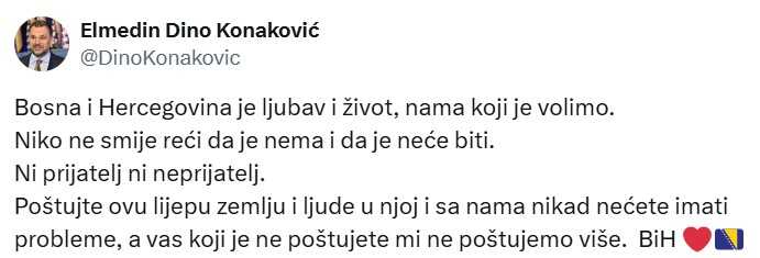 Ministar vanjskih poslova Bosne i Hercegovine i prvi čovjek stranke Narod i Pravda Elmedin Konaković reagirao je na prozive hrvatskih političara zbog protestne note koju je uputio Hrvatskoj nakon izjave predsjednika parlamenta te zemlje datoj jučer u Mostaru.