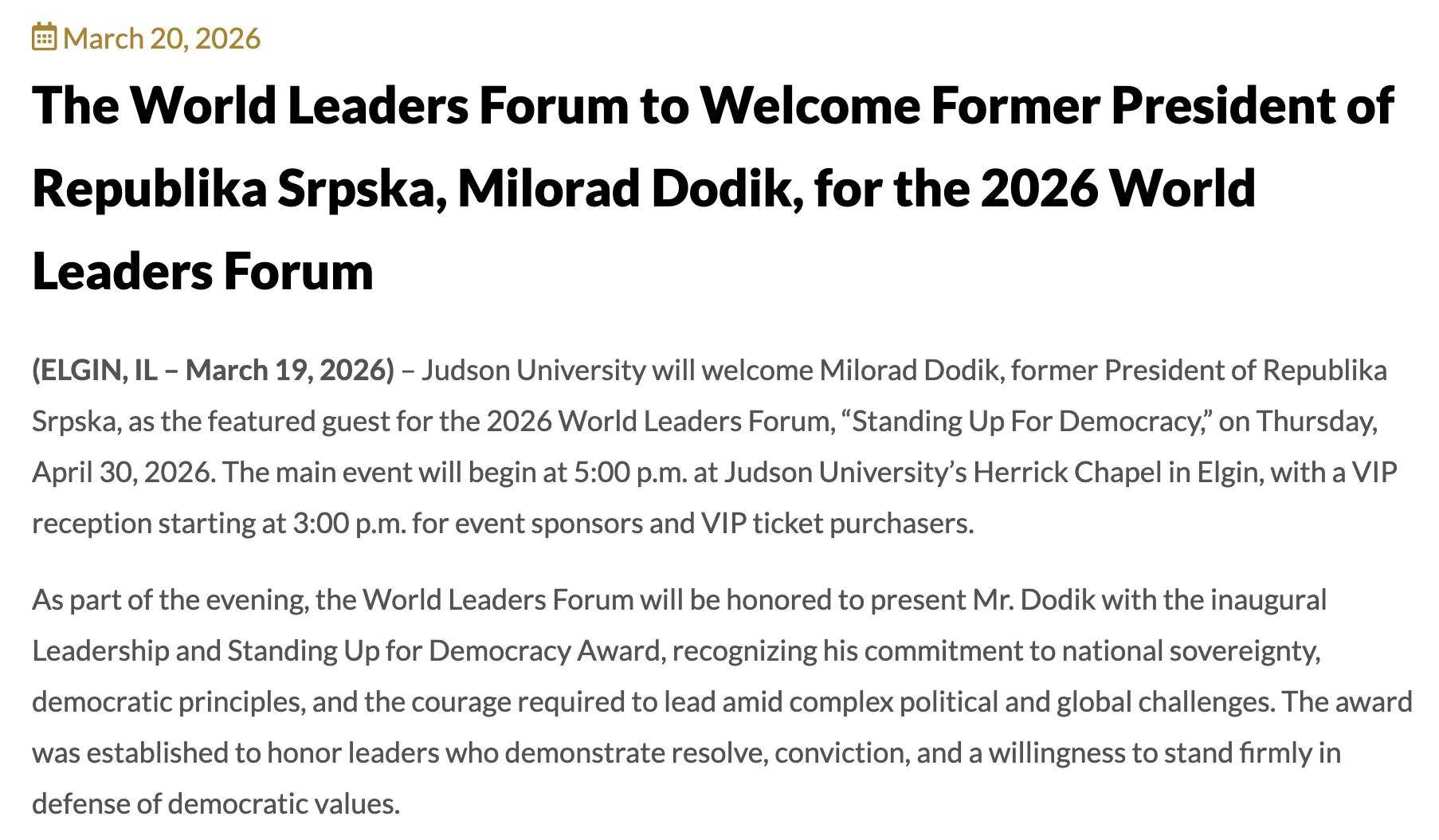 Američka kongresmenka Delia C. Ramirez reagovala je na najavu da će Milorad Dodik biti gost i dobitnik priznanja na Univerziteta Judson u američkoj saveznoj državi Ilinois, ocijenivši takav potez neprihvatljivim.