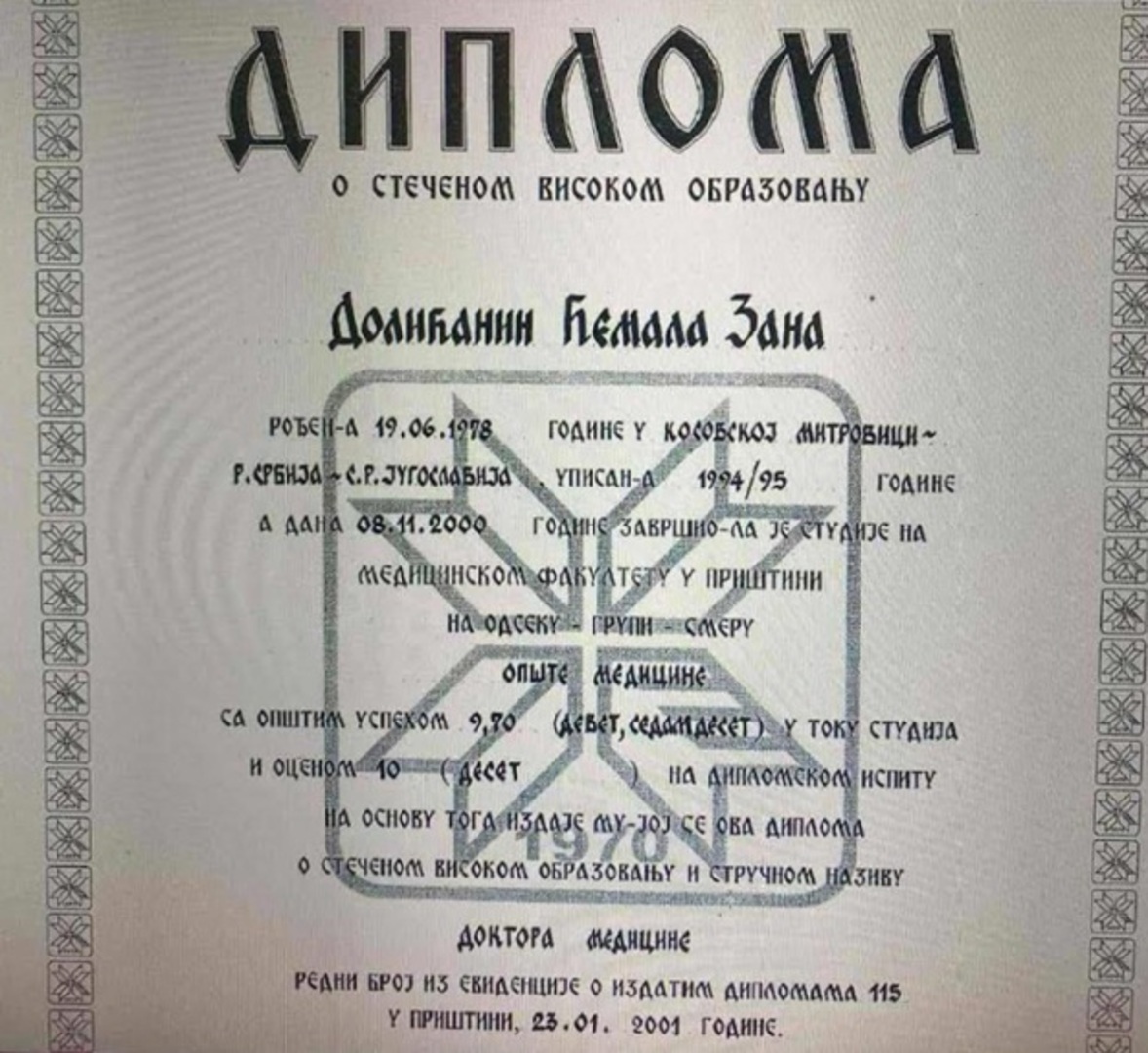 Prema kopiji diplome iz 2001. koju je izdao Medicinski fakultet u Prištini, Dolićanin, rođena 1978. godine, navodno je upisala fakultet 1994. godine, neposredno nakon navršenih 16 godina života. Fakultet je, prema saopštenju plenuma, završila 2000. godine “u roku sa prosjekom 9,7”, a “sa samo 22 godine postala vjerovatno najmlađi ljekar u istoriji Srbije”.