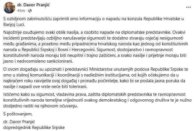 "S ozbiljnom zabrinutošću zaprimili smo informaciju o napadu na konzula Republike Hrvatske u Banjoj Luci. Najoštrije osuđujemo svaki oblik nasilja, a osobito napade na diplomatske predstavnike", poručio je Pranjić.