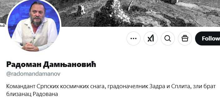 Osim što je "komandant srpskih kosmičkih snaga", predstavlja se i kao "gradonačelnik Zadra i Splita" i "zli brat blizanac Radovana". Nije napisao kojeg, ali nije teško pretpostaviti.