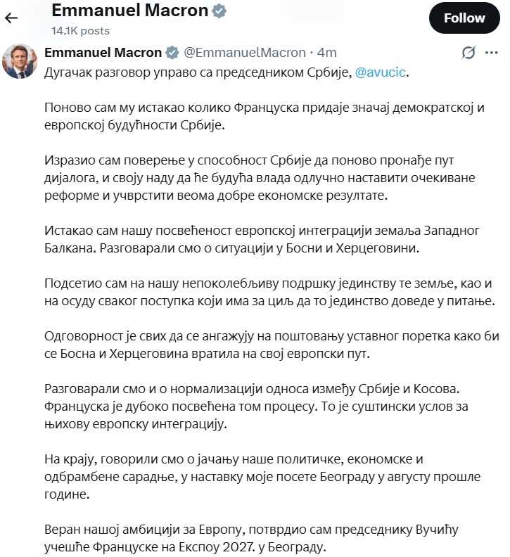 "Na kraju, govorili smo o jačanju naše političke, ekonomske i odbrambene saradnje, u nastavku moje posjete Beogradu u augustu prošle godine", stoji u postu predsjednika Francuske na X-u.