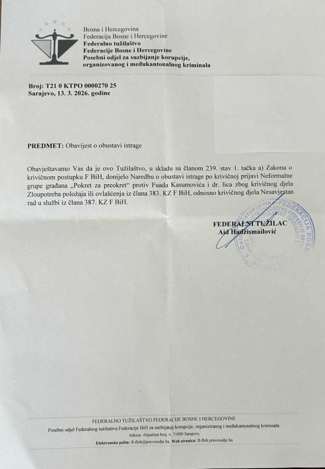Prema mojim evidencijama, ovo je 111. krivična prijava koju su politički predstavnici SDA podnijeli protiv mene tokom mog mandata. Gotovo svaki razvojni projekat koji je Grad Zenica pokrenuo bio je praćen sličnim prijavama, medijskim spinovima i pokušajima političke diskreditacije. Takva praksa jasno pokazuje da se ne radi o zaštiti zakonitosti, nego o pokušaju političke opstrukcije i kompromitacije nosilaca izvršne vlasti.